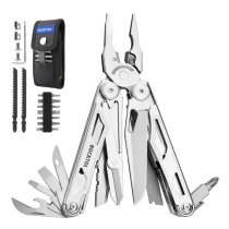 Міцний багатофункціональний інструмент 29 в 1: цей потужний багатофункціональний інструмент поєднує 29 інструментів, основні з яких доступні у складеному положенні, такі як кишеньковий ніж, зубчастий ніж, змінна пила по дереву та напильник по дереву/металу, а також великі пружні ножиці. Інші функції включають звичайні плоскогубці, гострогубці, змінні кусачки для дроту, інструменти для зачистки дротів, шило, відкривалки для пляшок і консервних банок, шліцеві та плоскі викрутки, біт-викрутка з 8 двосторонніми бітами (SP8+SP4, TT25+TT TT10, SL6+SL5, SL4+SL3, H5+H4, H3+H2.5, PH2+PH1). Всі інструменти мають запобіжні замки для впевненого використання.